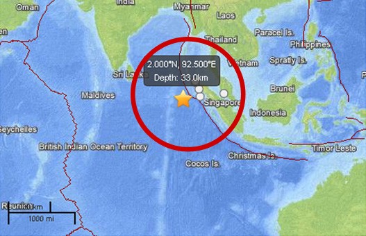 Zemljotres se dogodio u osam sati i 38 minuta po srednjeevropskom vremenu, pod morem na dubini od 33 kilometra, oko 430 kilometara jugozapadno od prestonice provincije Aćeh na ostrvu Sumatra, navodi Američki geofizički institut, koji je jačinu zemljotresa najpre procenio na 8,9, a potom na 8,7 stepeni.